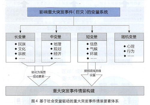 重大突發(fā)事件本身是一個(gè)復(fù)雜系統(tǒng)。當(dāng)嘗試通過“情景構(gòu)建”來表征重大突發(fā)事件的規(guī)律特點(diǎn)時(shí),按照社會(huì)物理學(xué)理論,需要對(duì)一系列社會(huì)變量進(jìn)行描述,決定重大突發(fā)事件情景的變量包含:長變量(與民族、文化、宗教相關(guān)的變量)、中變量(與地理、規(guī)劃、經(jīng)濟(jì)、社會(huì)相關(guān)的變量)、短變量(與信息、氣候、環(huán)境、交通等相關(guān)的變量)、隨機(jī)變量(與心理、行為以及未知因素相關(guān)的變量)(見圖4)。為確保重大突發(fā)事件情景能夠準(zhǔn)確地代表不斷演化的國家風(fēng)險(xiǎn)(或者地區(qū)風(fēng)險(xiǎn)),情景構(gòu)建過程中,需將上面所述的長變量與中變量設(shè)置為情景恒定要素,當(dāng)這兩類變量發(fā)生變動(dòng)時(shí),需要及時(shí)修訂情景;此外,關(guān)于短變量,應(yīng)該基于“底線思維”,設(shè)置可能導(dǎo)致事件往最壞方向發(fā)展的變量,這樣可以有效保證與情景所匹配的目標(biāo)能力具備“冗余”。而隨機(jī)變量,對(duì)于情景構(gòu)建來說不具備較大價(jià)值,不應(yīng)該在情景中描述。