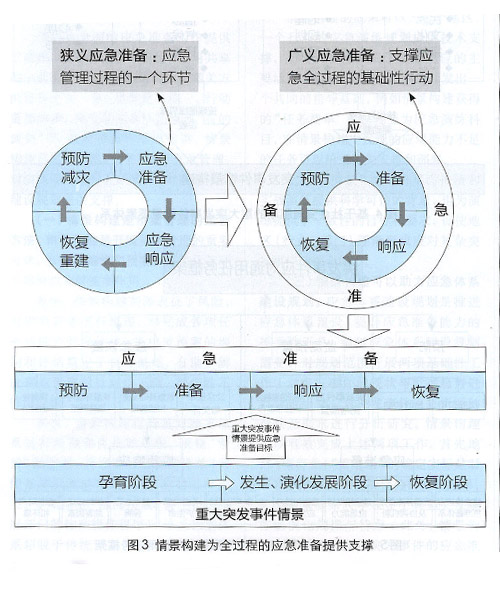 (一)全過程、多角度的情景分析。經(jīng)典的應(yīng)急管理理論,將應(yīng)急管理過程劃分為四個(gè)階段:預(yù)防、準(zhǔn)備、響應(yīng)和恢復(fù)。近十年應(yīng)急管理學(xué)界逐步認(rèn)識(shí)到應(yīng)急準(zhǔn)備的重要性,將其從單純一個(gè)過程環(huán)節(jié)提升為“支撐應(yīng)急全過程”的基礎(chǔ)性行動(dòng),進(jìn)而有了“廣義應(yīng)急準(zhǔn)備”和“狹義應(yīng)急準(zhǔn)備”兩個(gè)不同的概念,如圖3所示。