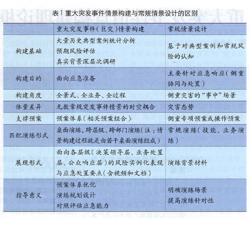 在傳統(tǒng)應(yīng)急管理中,實(shí)戰(zhàn)演練之前往往開展情景設(shè)計(jì),常規(guī)情景設(shè)計(jì)與重大突發(fā)事件情景構(gòu)建無論在研究體量、研究目的,還是研究意義都存在著一定的差異,如表1所示。