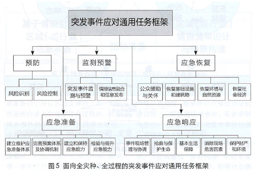 筆者所在課題組參考美國UTL的格式,對(duì)我國多災(zāi)種的應(yīng)對(duì)任務(wù)進(jìn)行了分析,提出了符合我國體制機(jī)制特點(diǎn)的突發(fā)事件應(yīng)對(duì)通用任務(wù)框架,該框架包含5類任務(wù)領(lǐng)域、17類一級(jí)任務(wù)、64類二級(jí)任務(wù)(如圖5所示)。該任務(wù)框架是面向全災(zāi)種、全過程的任務(wù)框架,無論哪種類型的突發(fā)事件情景,均可在該框架的引導(dǎo)下開展任務(wù)梳理。