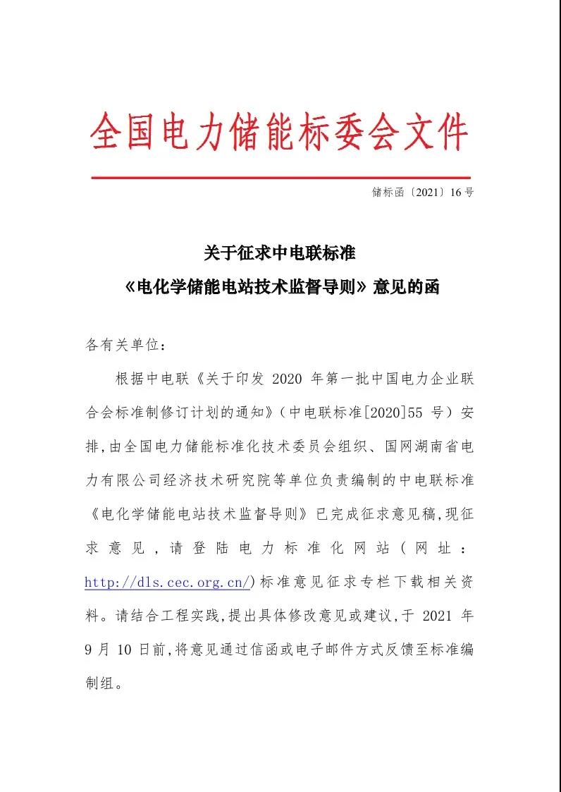 征求意見:關于征求中電聯標準《電化學儲能電站技術監督導則》意見的函