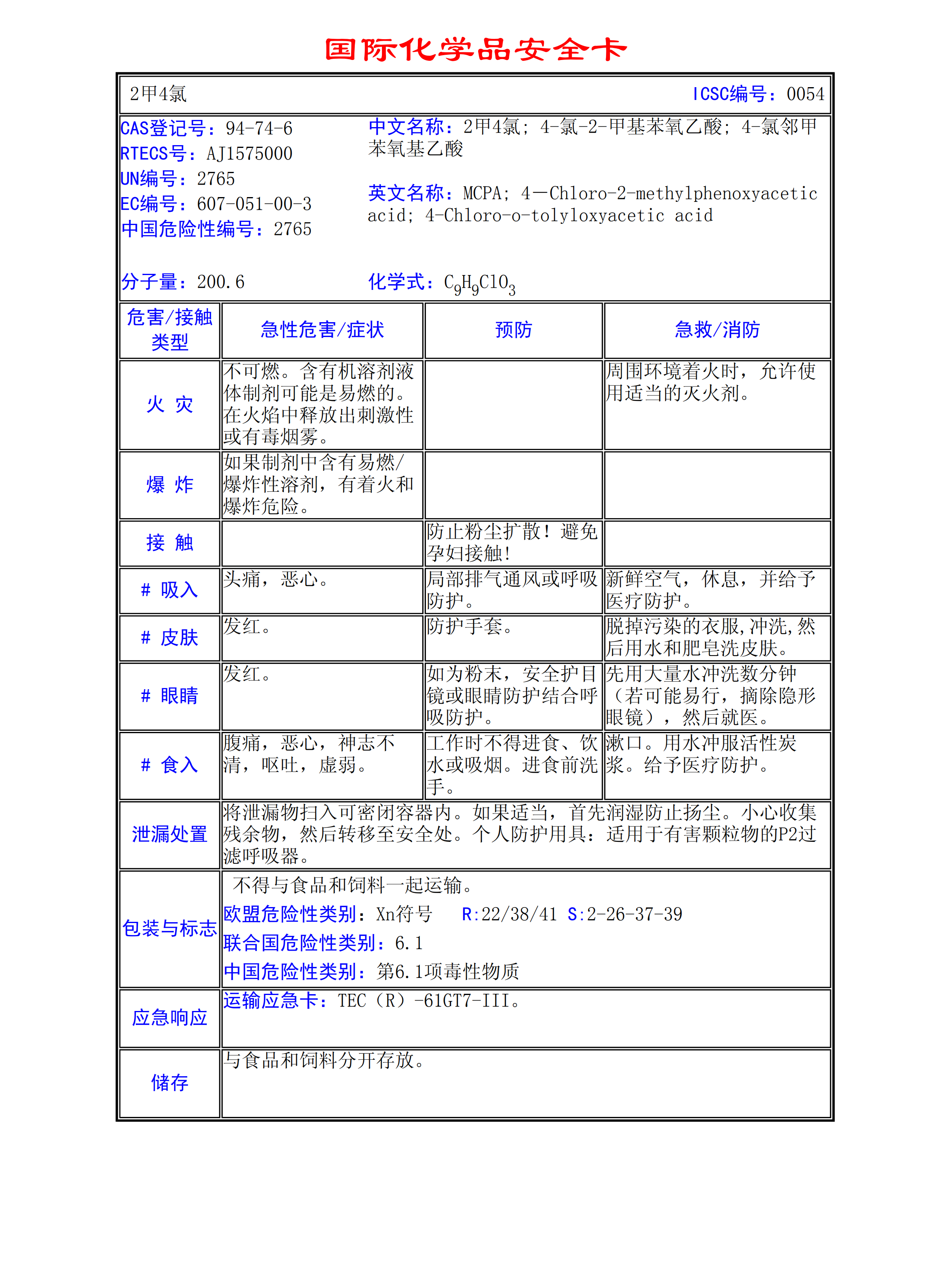 2甲4氯MSDS
