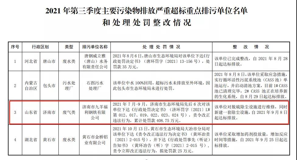 近日,生態環境部公布2021年第三季度主要污染物排放嚴重超標重點排污單位名單和處理處罰整改情況。其中,濟南市九羊福利鋼鐵有限公司因廢氣類污染等環境違法行為,累計處罰款408.75萬元。