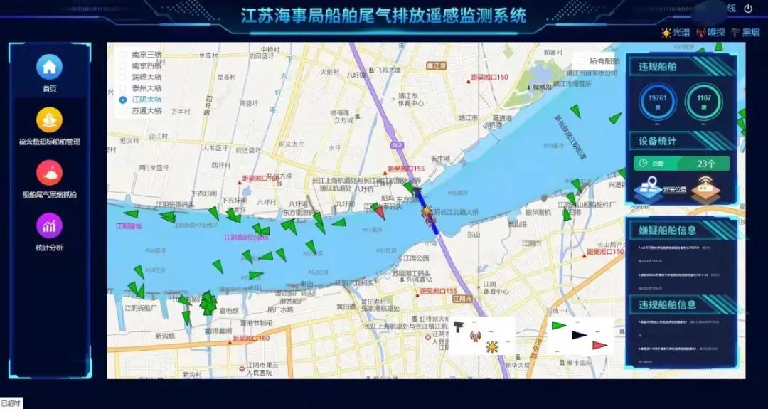 2022年1月1日,江蘇海事局船舶尾氣排放遙感監測系統上線試運行,在長江江蘇段6座大橋建設23套船舶尾氣排放檢測設備,該系統覆蓋過往船舶更全、遙感監測種類更多、現場執法效率更高。近日,江陰海事局查獲該系統運行以來首起在航船舶燃油超標違法行為,并對監測系統中抓拍的3艘船舶尾氣明顯黑煙情況通報其船公司。1月6日,江陰海事局執法人員在收到系統自動報警后,立即組織人員對“軍**”輪開展了船舶燃油取樣并實施硫含量快速檢測,后經專業機構檢測硫含量為0.61%m/m,燃油含硫量明顯超標,該行為違反了《中華人民共和國大氣污染防治法》相關規定,江陰海事局依法對其實施了行政處罰。江陰海事局通過黑煙抓拍子系統報送的報警信息進行研究分析,決定對黑煙狀況明顯的3艘船舶所屬船公司下發《船舶黑煙污染防治建議書》,要求其認真排查船舶主機工況、燃油使用等情況,切實采取措施消除船舶黑煙,并在規定時間內反饋整改情況。在長江江陰段轄區,依托江陰長江大橋架設了3套采用光譜、嗅探等不同工作原理的硫含量監測、黑煙抓拍等專業設備,船舶尾氣排放遙感監測系統成為江陰海事局深化建設船舶污染防治“江蘇模式”江陰樣板區、精準防治船舶尾氣污染、助力打贏藍天保衛戰的科技利器。