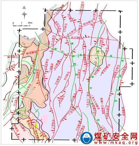 山東龍鄆煤業(yè)有限公司前身為山東省鄆城煤礦,位于菏澤市鄆城縣潘渡鎮(zhèn)境內(nèi),南距鄆城縣城 6 千米。原隸屬于山東省齊魯新航集團(tuán)有限責(zé)任公司,2006 年 9 月開(kāi)工建設(shè)。2011 年 1 月起,山東省鄆城煤礦由龍礦集團(tuán)托管。2016 年 6 月,龍礦集團(tuán)與山東省齊魯新航集團(tuán)有限責(zé)任公司簽訂了《山東省鄆城煤礦移交接管劃轉(zhuǎn)協(xié)議》,礦井的生產(chǎn)建設(shè)主體變更為龍礦集團(tuán)。2017 年 4 月,礦井正式投產(chǎn),設(shè)計(jì)生產(chǎn)能力 240 萬(wàn)噸/年。2017 年 12 月,礦井更名為山東龍鄆煤業(yè)有限公司(以下簡(jiǎn)稱(chēng)龍鄆煤礦)。2017 年 5~12 月,生產(chǎn)原煤 160 萬(wàn)噸;2018 年 1~9 月,生產(chǎn)原煤 177.73萬(wàn)噸。礦井采礦許可證、安全生產(chǎn)許可證、工商營(yíng)業(yè)執(zhí)照齊全有效。礦井開(kāi)采條件。井田位于巨野煤田最北端,屬全隱蔽的華北型石炭、二疊系煤田。井田范圍由 20 個(gè)拐點(diǎn)坐標(biāo)圈定,面積 198.3 平方公里,開(kāi)采標(biāo)高-450~-1750 米。井田含煤地層為山西組和太原組,其中主采煤層為山西組 3 煤層。井田處于鄆城斷裂、巨野斷裂、曹縣斷裂和汶泗斷裂的“井”字形中間區(qū)內(nèi),井田的典型構(gòu)造特征為斷塊型。井田總體呈走向近南北、傾向東的單斜構(gòu)造,勘查發(fā)現(xiàn)全井田共有斷層 130 條,其中,一采區(qū) 37 條。見(jiàn)圖 1。