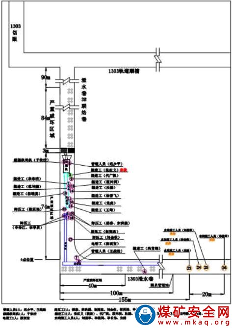 《沖擊危險(xiǎn)區(qū)封閉、準(zhǔn)入及限員制度》和《1303 工作面泄水巷掘進(jìn)工作面作業(yè)規(guī)程》規(guī)定:“掘進(jìn)工作面割煤期間及割煤后15 分鐘內(nèi),迎頭往外 50 米范圍以?xún)?nèi),除掘進(jìn)機(jī)司機(jī)、掘進(jìn)機(jī)二運(yùn)轉(zhuǎn)載機(jī)看護(hù)人員外,嚴(yán)禁無(wú)關(guān)人員在此處逗留,并在進(jìn)入工作面迎頭向外 150 米處懸掛‘沖擊危險(xiǎn)區(qū)域、嚴(yán)禁人員進(jìn)入’牌板,設(shè)置限員準(zhǔn)入管理站,警戒區(qū)域內(nèi)作業(yè)人員不得超過(guò) 26 人”。限員管理站設(shè)置在拐點(diǎn)以外 100 米處,距迎頭 174 米,管理站放置 10 件防沖服。事故發(fā)生時(shí),管理站以里有 24 人。見(jiàn)圖 3。
