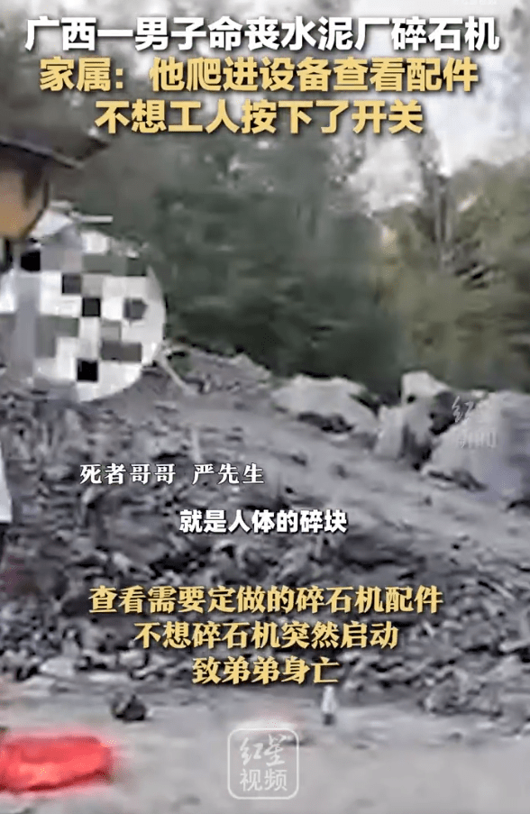 6月12日,廣西北流的嚴(yán)先生爆料稱,5月25日,他的弟弟受邀前往一家水泥廠查看需要定做的碎石機(jī)配件,不想碎石機(jī)突然啟動(dòng),致弟弟身亡。